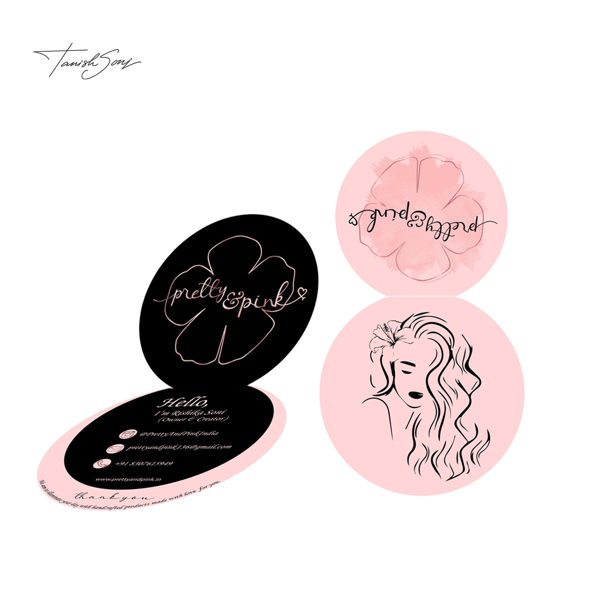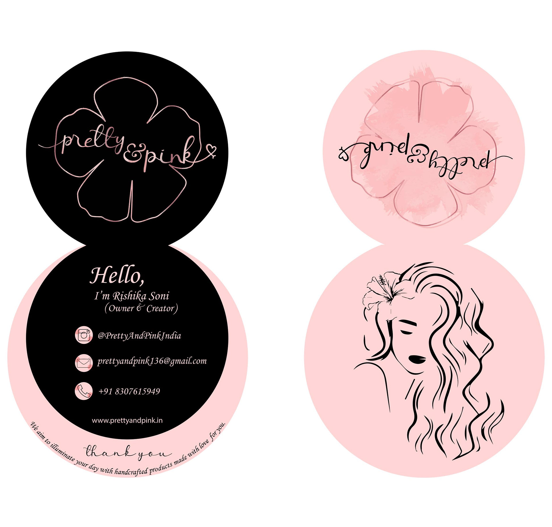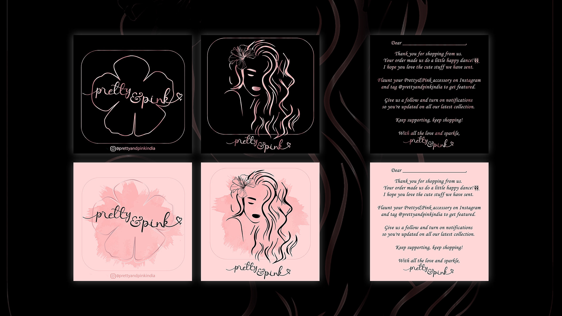 These packaging cards are designed as part of the unboxing experience. The first two visuals show two variations of the same front design, sent randomly with each order to keep it fresh while staying within the brand’s soft pink and black identity. The third image shows the back, featuring a heartfelt thank you note that adds a personal touch. Together, they turn a simple insert into a small but thoughtful brand moment.