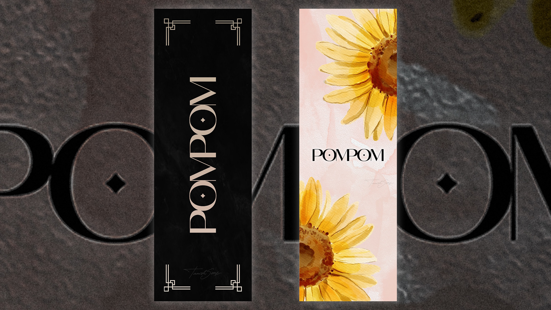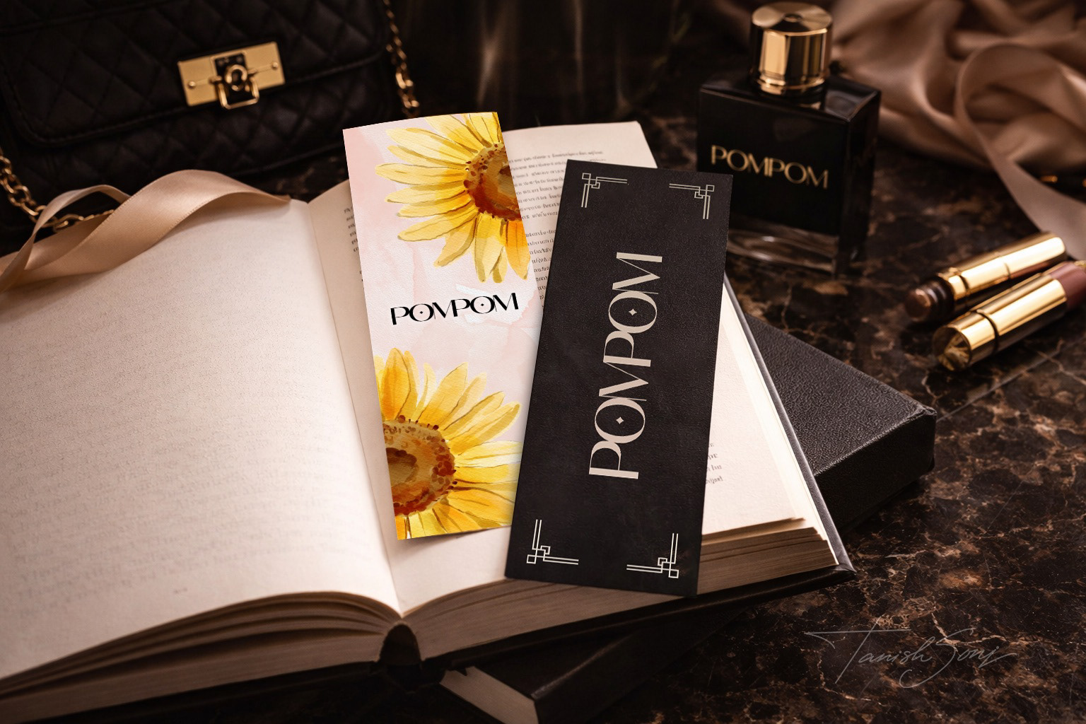The POM POM bookmark collection pairs bold luxury with soft elegance. The black edition feels timeless and polished with gold detailing, while the floral version adds warmth through delicate blooms. Two distinct moods, one refined and premium identity.