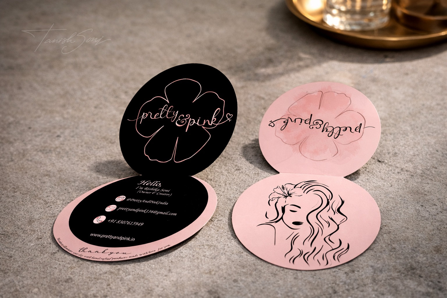 This business card was designed as a small object rather than a typical print piece. Its circular form is inspired by a pocket mirror, opening in soft pink and revealing a black inner panel with the logo and details. The contrast feels refined yet playful, and the fold adds a sense of reveal. Simple in structure, but distinctive in form, it gives the brand something people are likely to keep, not discard.