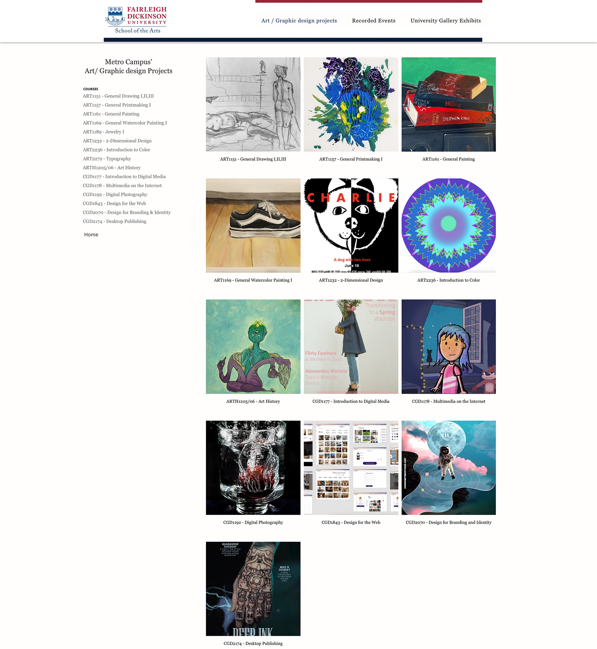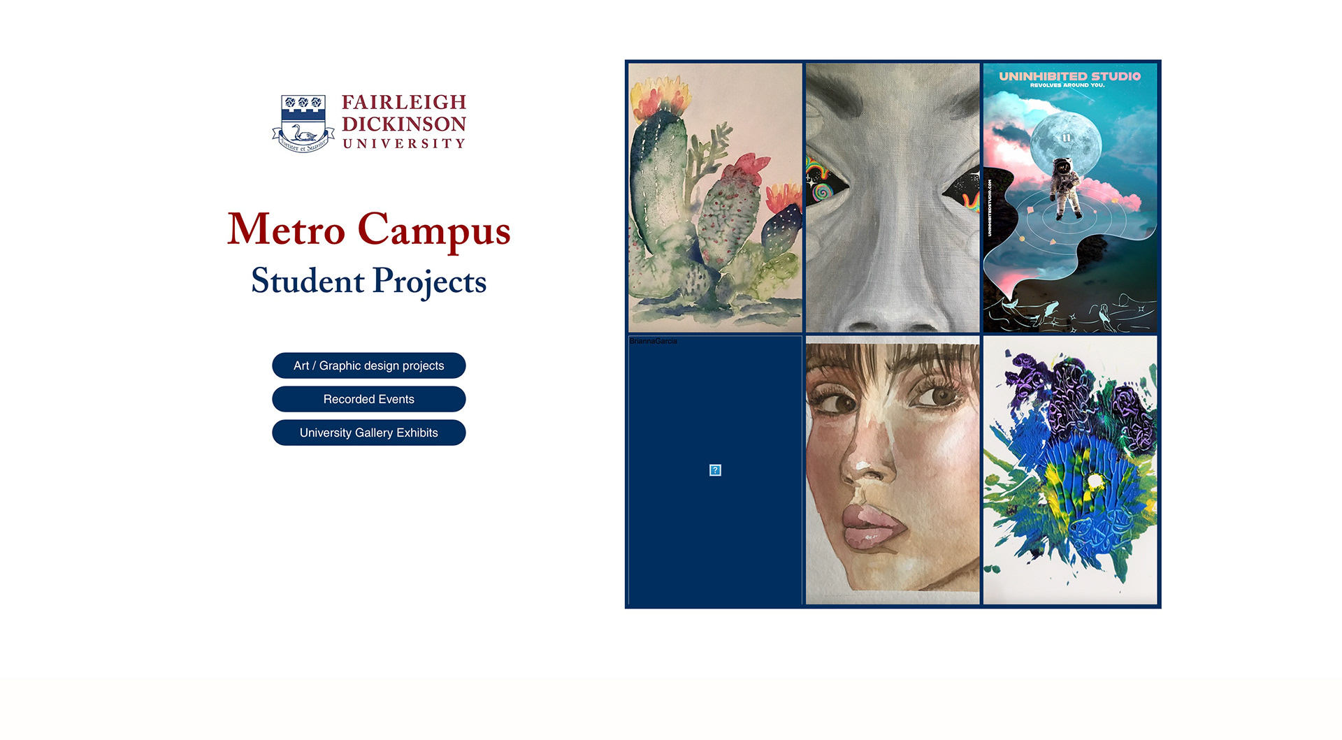 The landing page introduces Metro Campus Student Projects with a clean, balanced layout. A curated grid of standout student artworks appears alongside primary calls to action, immediately engaging visitors and highlighting creative excellence. Clear navigation buttons direct users to Projects, Recorded Events, and Gallery Exhibits.