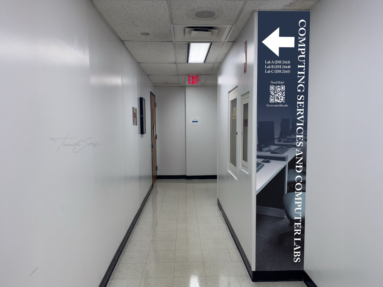 The photograph shows the graphic installed within the campus hallway, guiding students toward the computing labs.