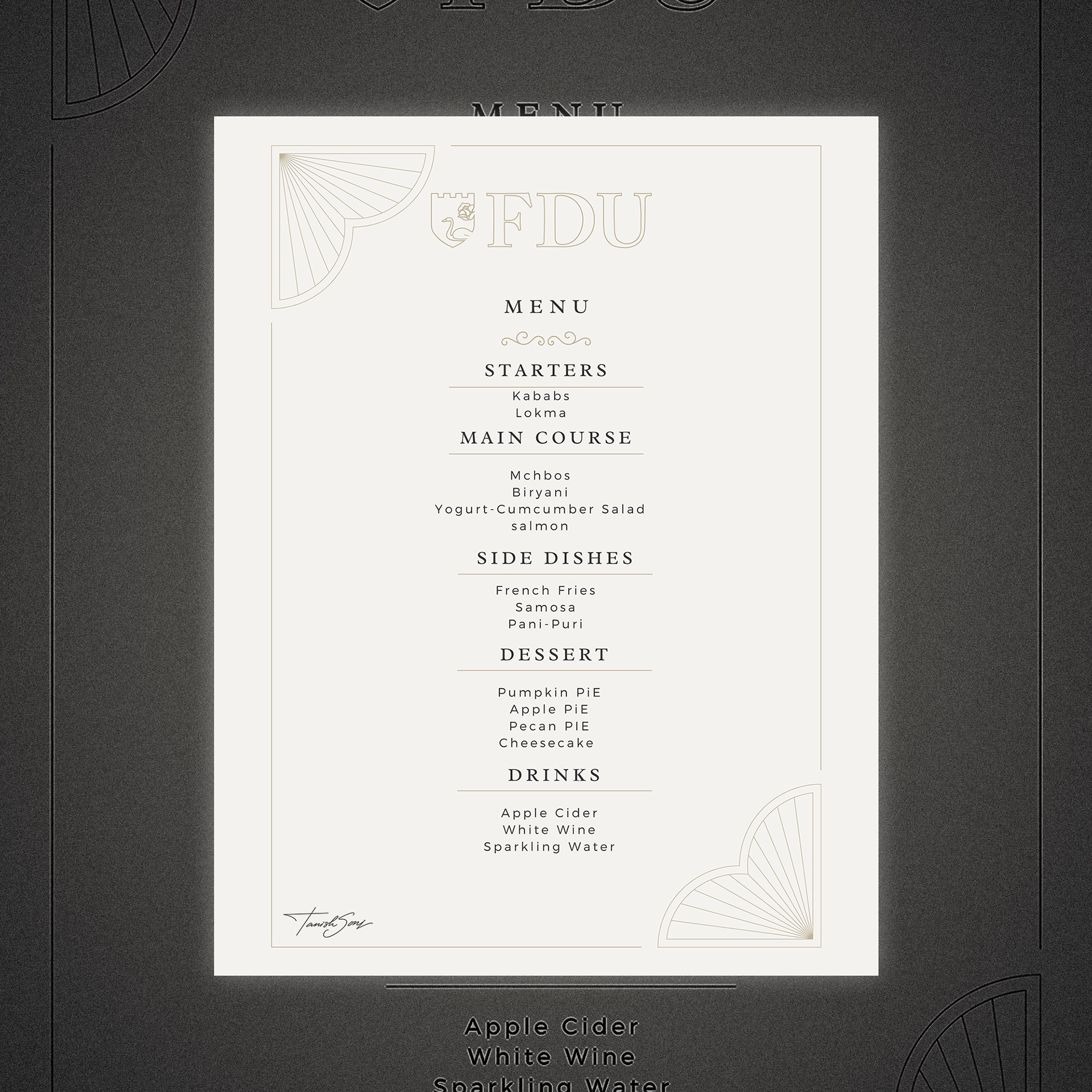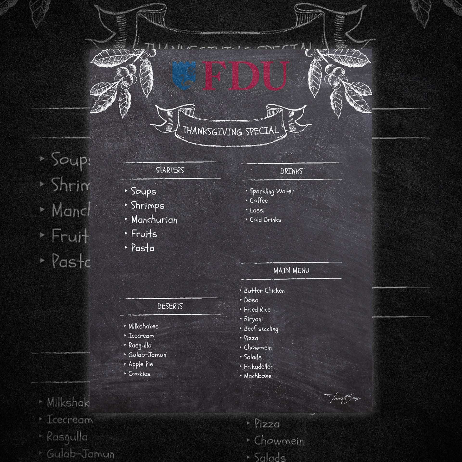 With soups, shrimps, butter chicken, fried rice, rasgulla, and apple pie, this menu highlights the university’s inclusive and multicultural spirit during a seasonal celebration. The chalkboard inspired theme creates a warm, welcoming tone aligned with campus festivities.
