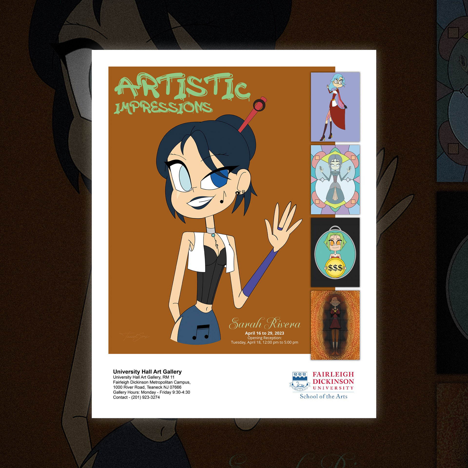 This poster features Sarah’s illustrated character as the focal point, reflecting her playful visual style. Additional works are displayed vertically to attract attention while keeping the layout simple, clean, and aligned with her artistic voice.