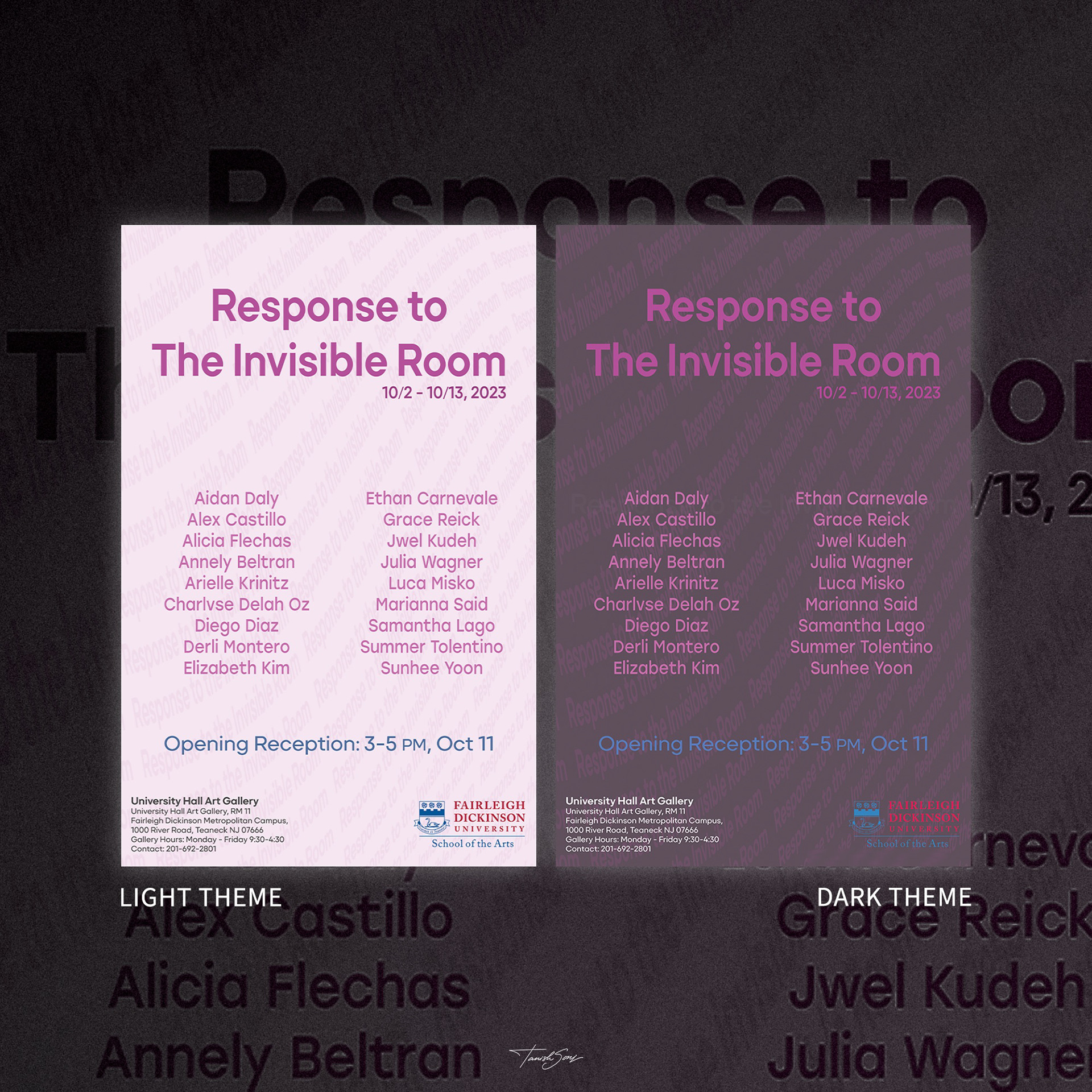 This exhibition advertising poster explores light and dark theme variations within a consistent typographic structure. Bold, centered headlines and a clean artist listing ensure clarity, while a subtle patterned background adds depth without distraction.