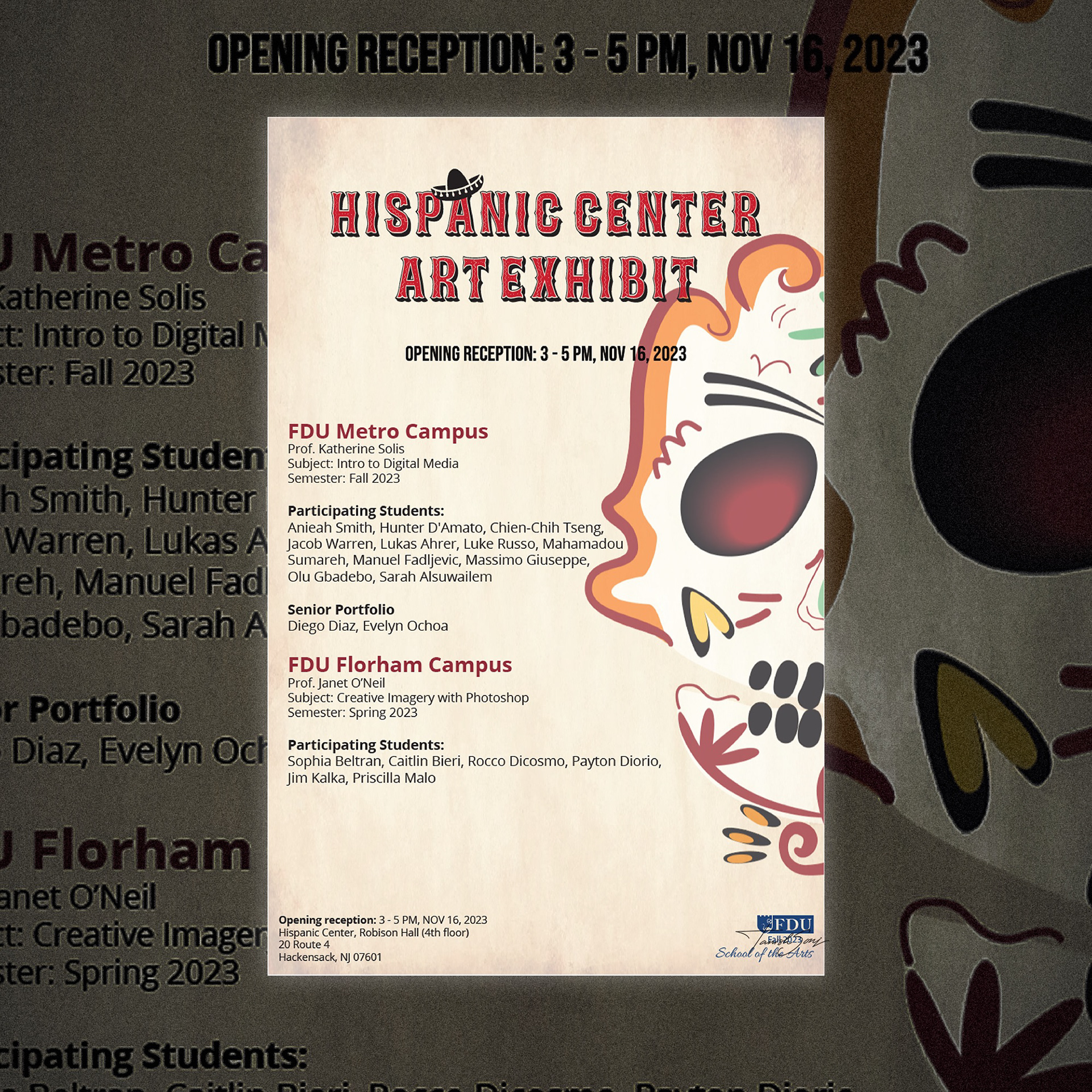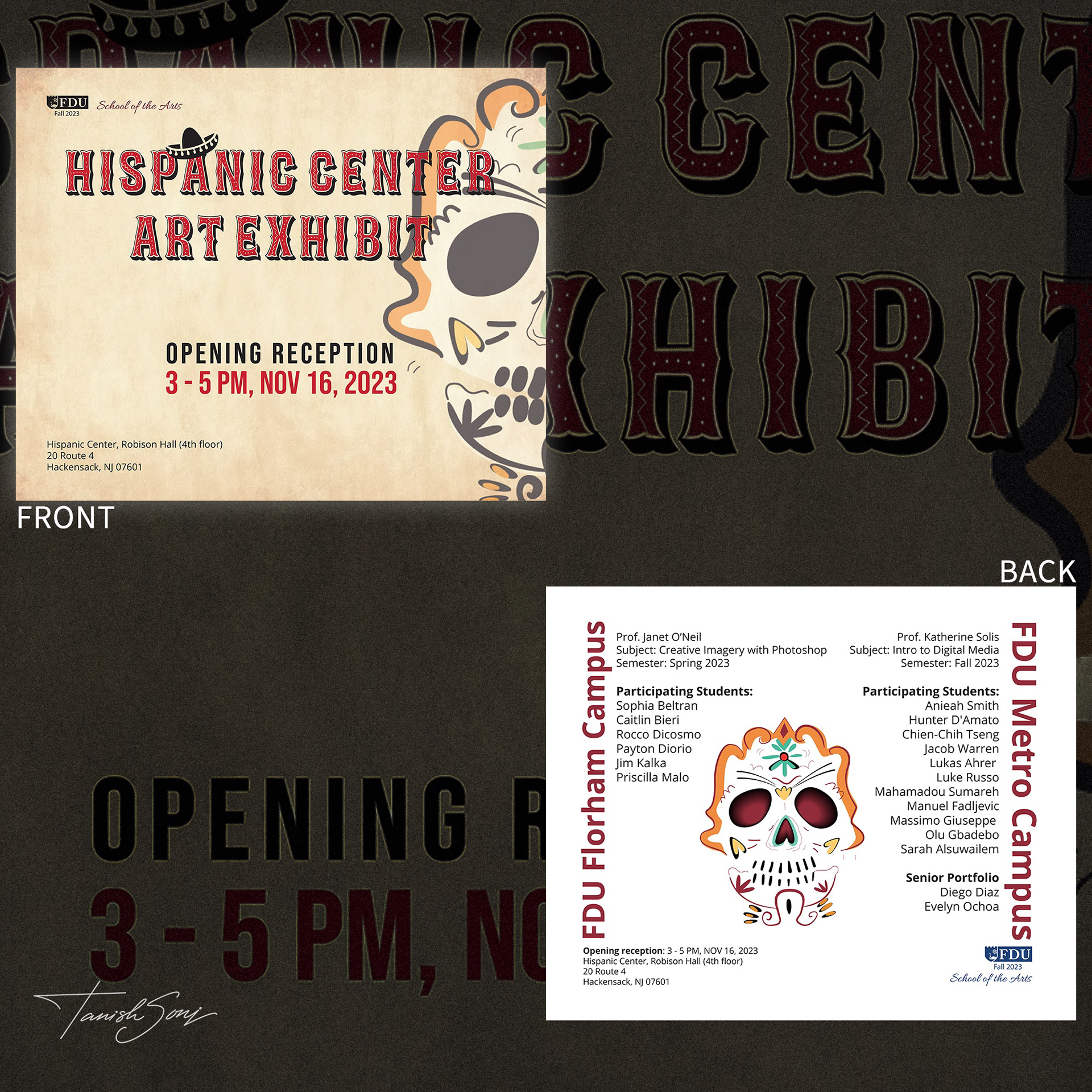 This poster incorporates cultural symbols such as the decorative skull, sombrero, warm red tones, and textured background to reflect Hispanic heritage and celebration. These elements create authenticity and visual energy while grounding the exhibition within its cultural context.