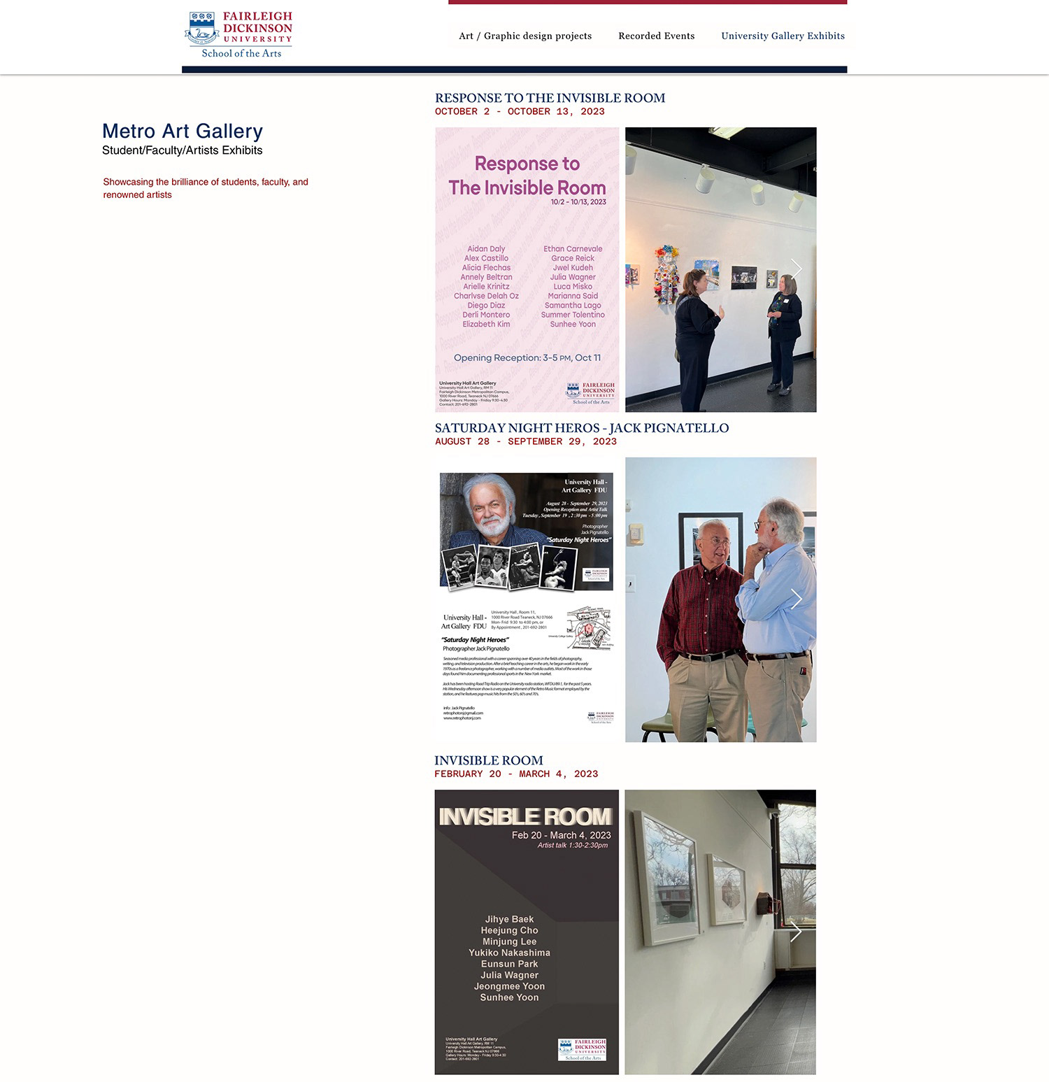 The exhibits page showcases posters and installation photography from recent shows. An interactive viewing feature allows users to browse multiple images per exhibition. The layout serves as a visual record of student, faculty, and guest artist exhibitions, celebrating the campus art community.