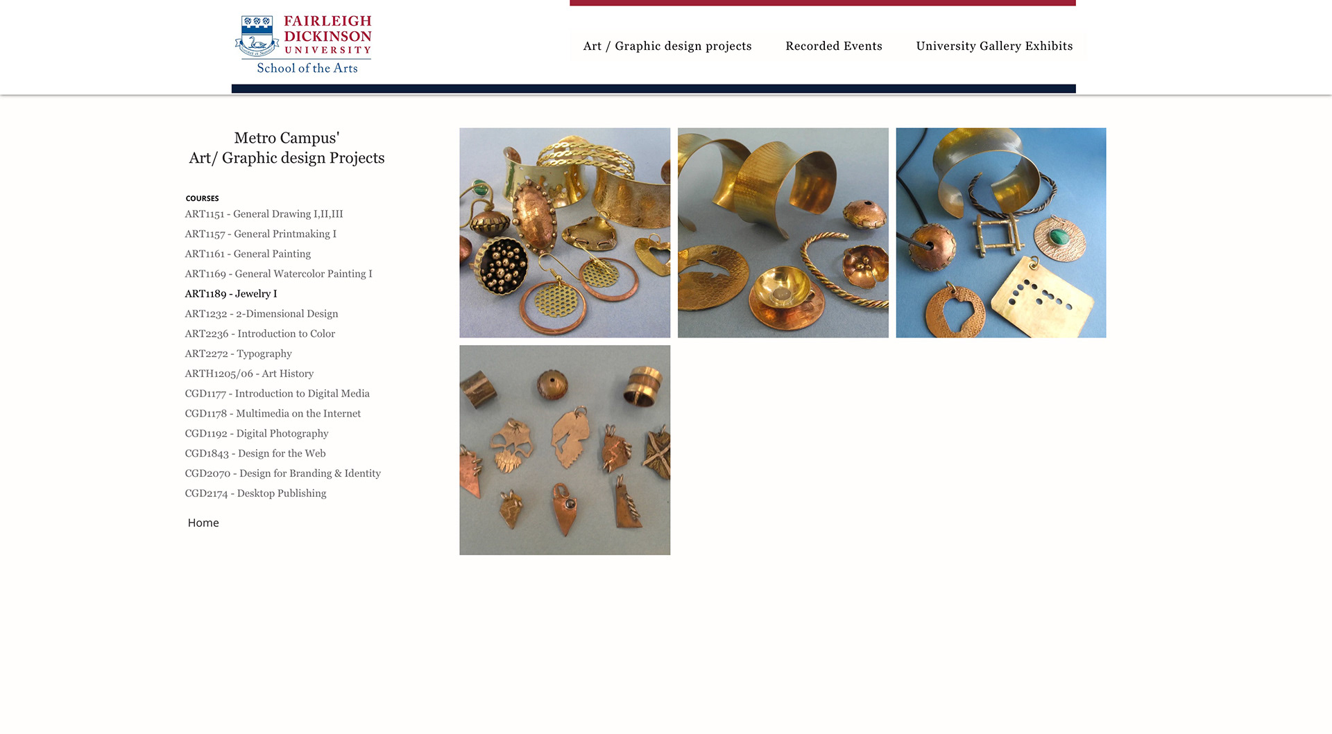 The course page presents detailed images of handcrafted jewelry, focusing on material, texture, and craftsmanship. The persistent sidebar allows effortless movement between courses. The design highlights technical development and creative experimentation within the program.