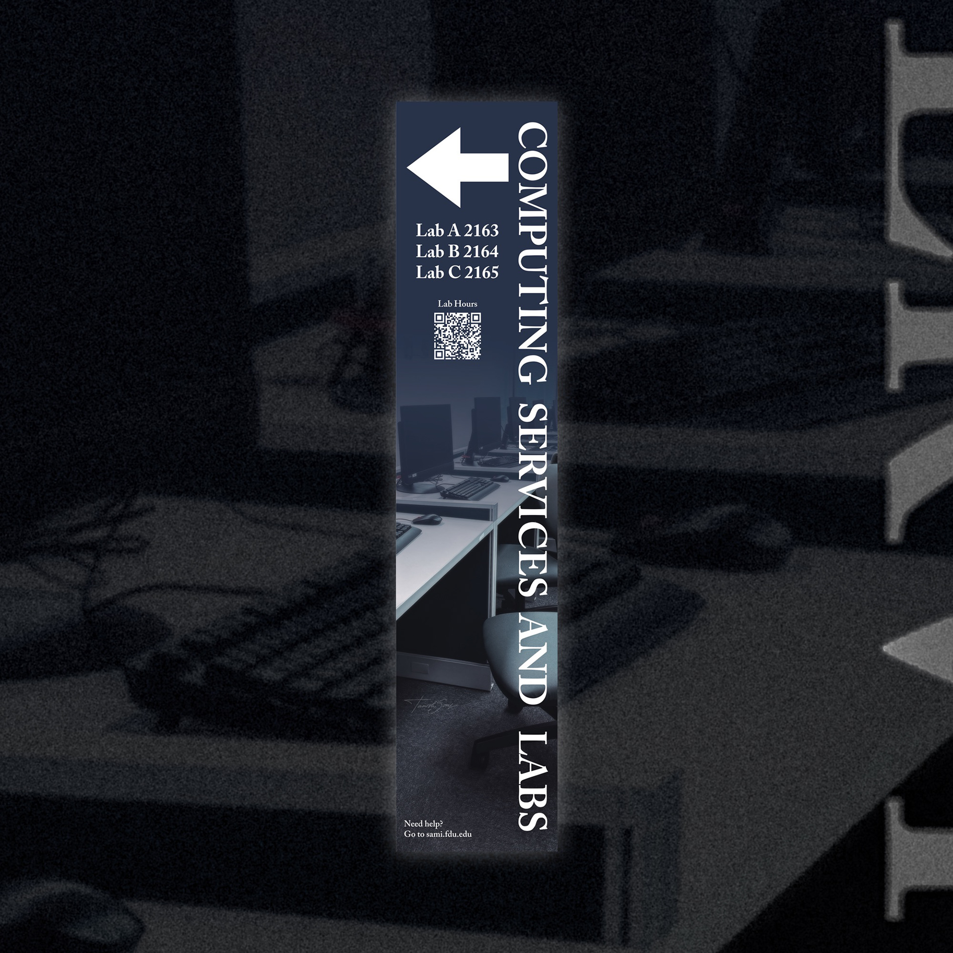 Designed to guide students to the computing labs, this directional graphic combines a bold arrow, vertical typography, and clear lab numbers for instant clarity. A QR code provides quick access to lab hours, while the layout ensures high visibility within a narrow corridor.