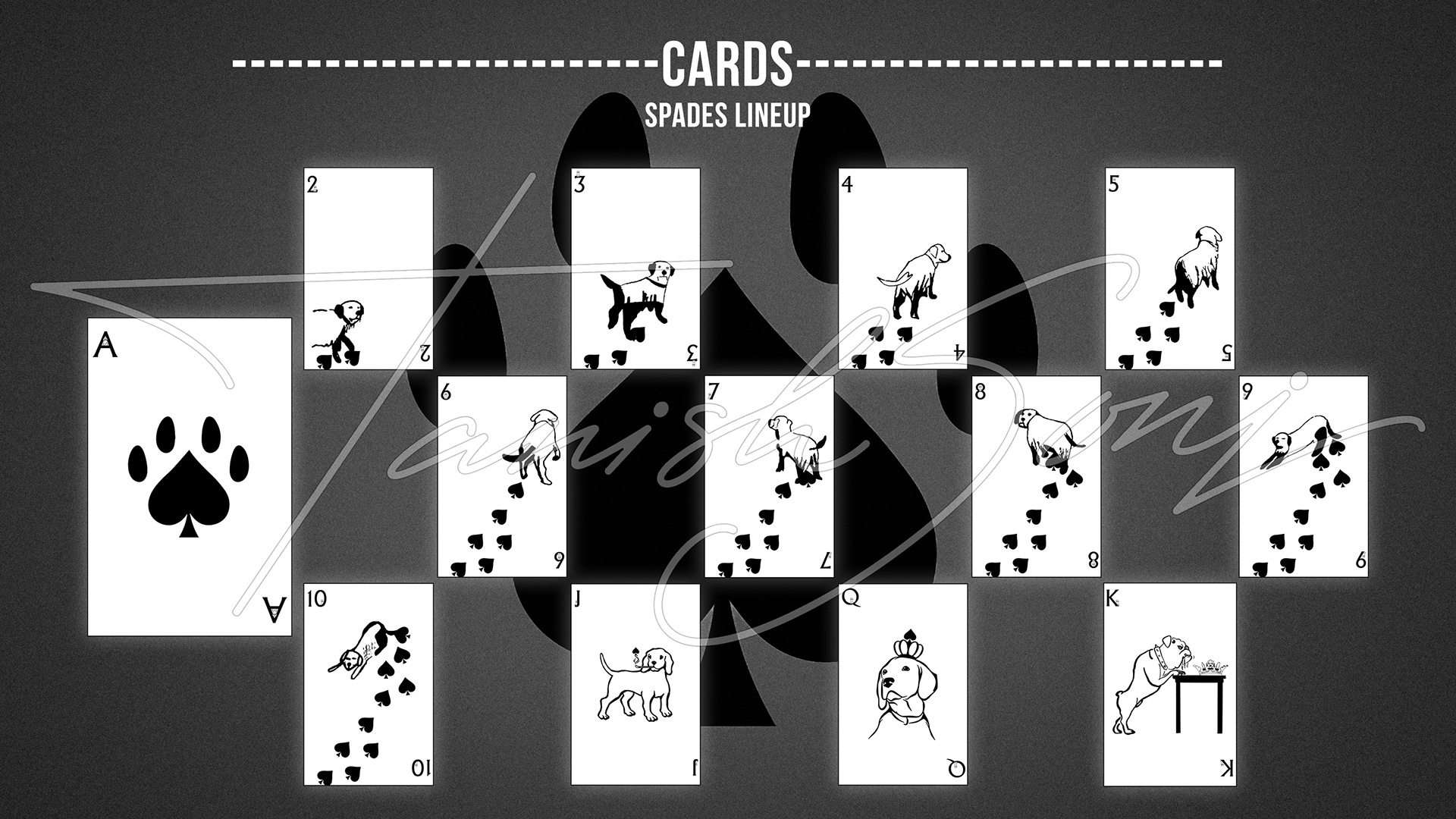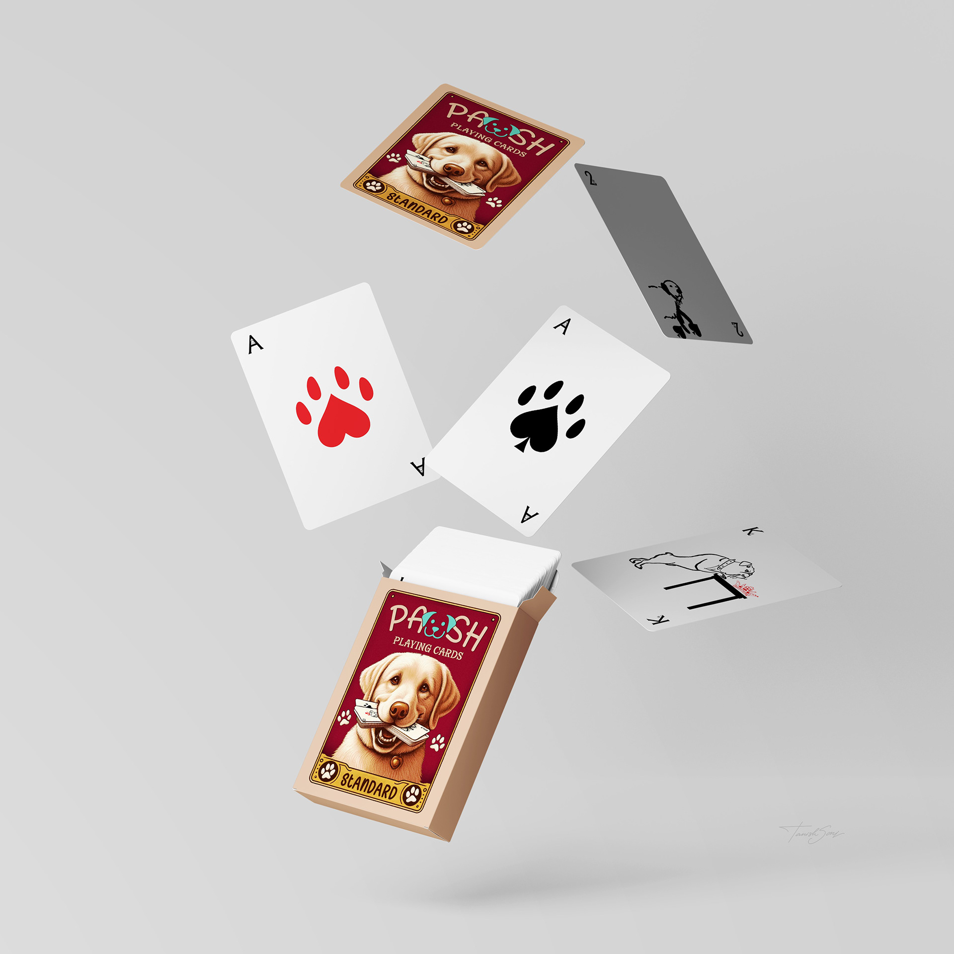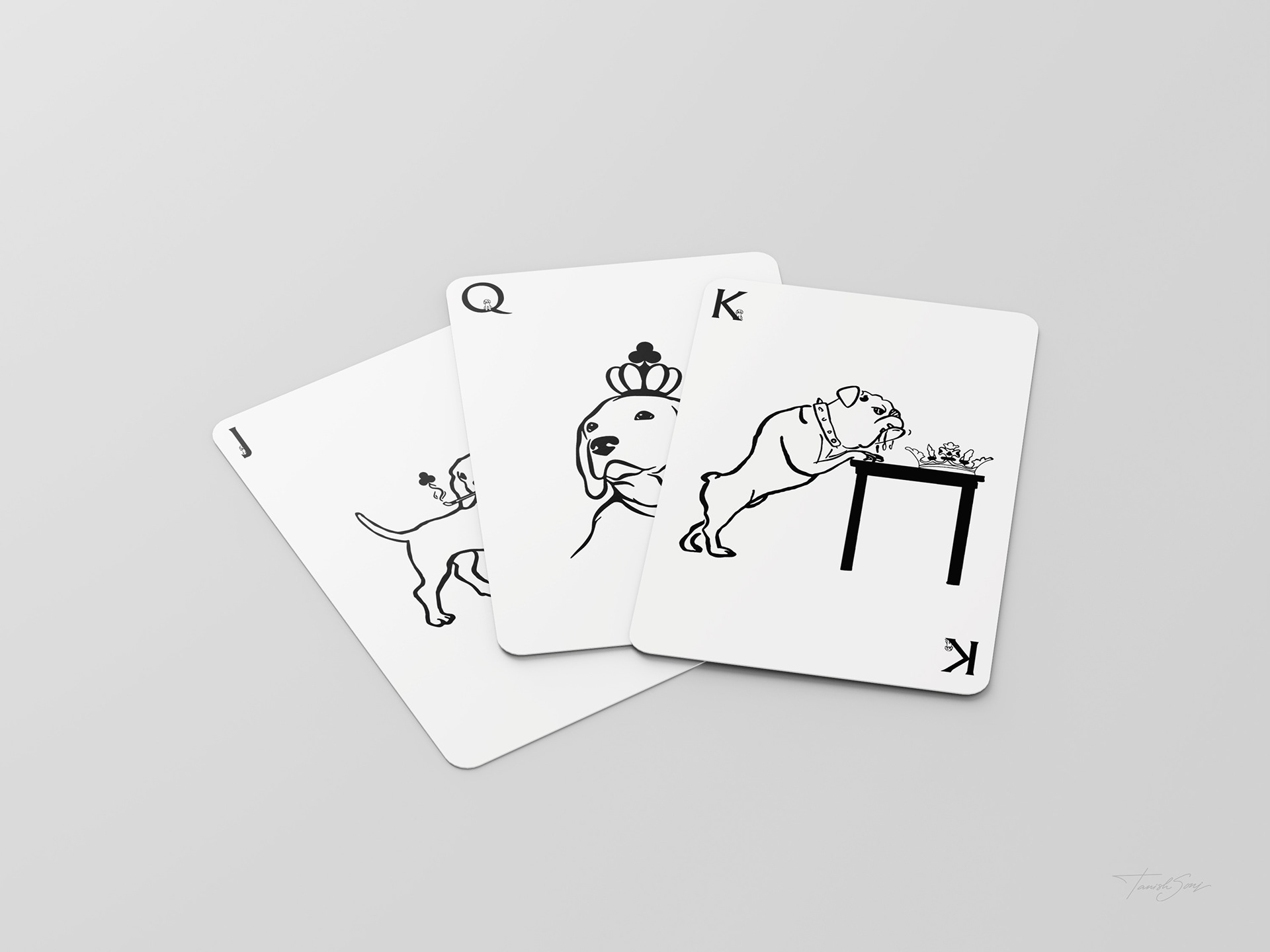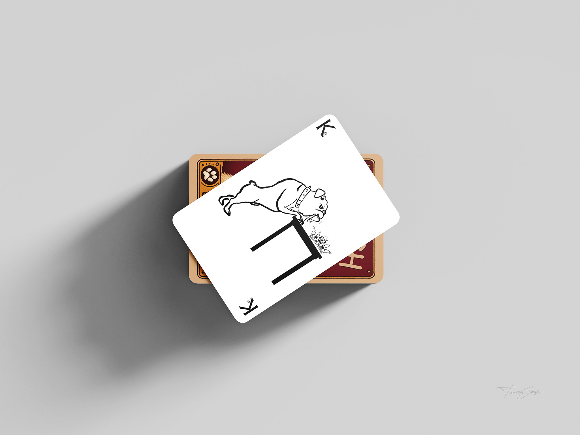 The playing cards reinterpret a classic deck through a focused dog themed system. The box features a vintage inspired illustration that gives the set a collectible presence. Across all suits, the Ace becomes a bold paw symbol, number cards progress through increasing dog footsteps, and the face cards introduce defined canine characters. The Jack stands with a cigar, the suit mark rising as smoke. The Queen appears in profile with a crown marked by the suit symbol. The King leans against a table, his crown placed beside him with the symbol embedded. Clean line work, generous space, and traditional corner indices keep the deck familiar while giving it a distinct identity.