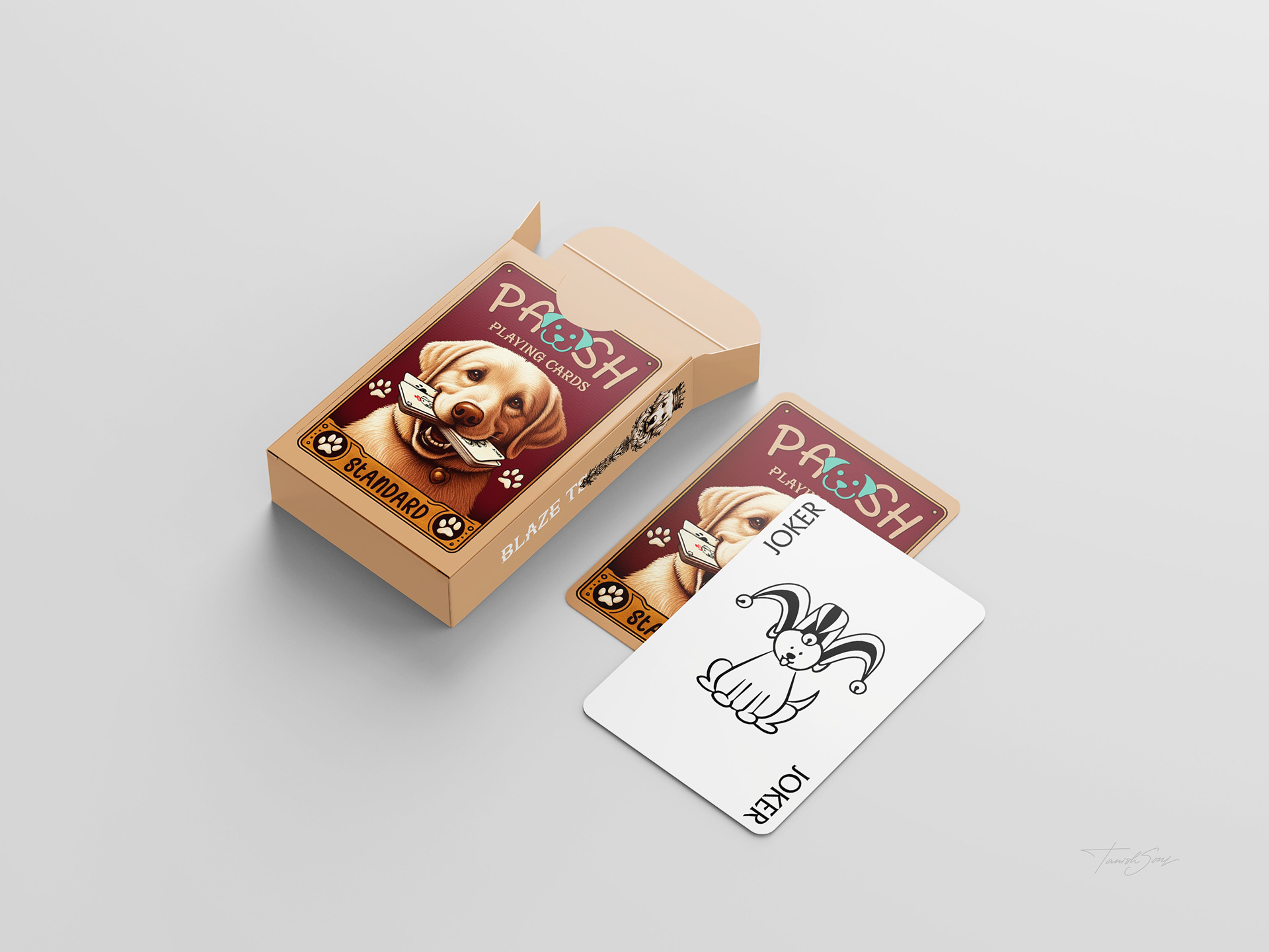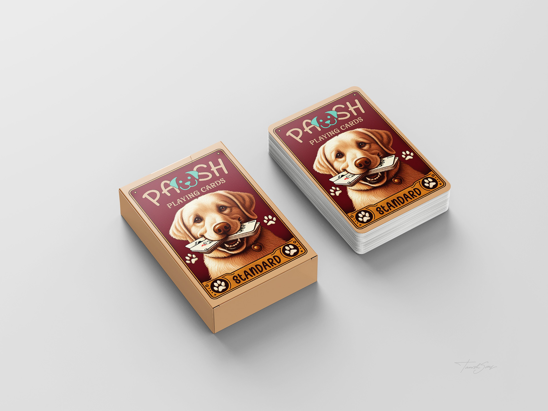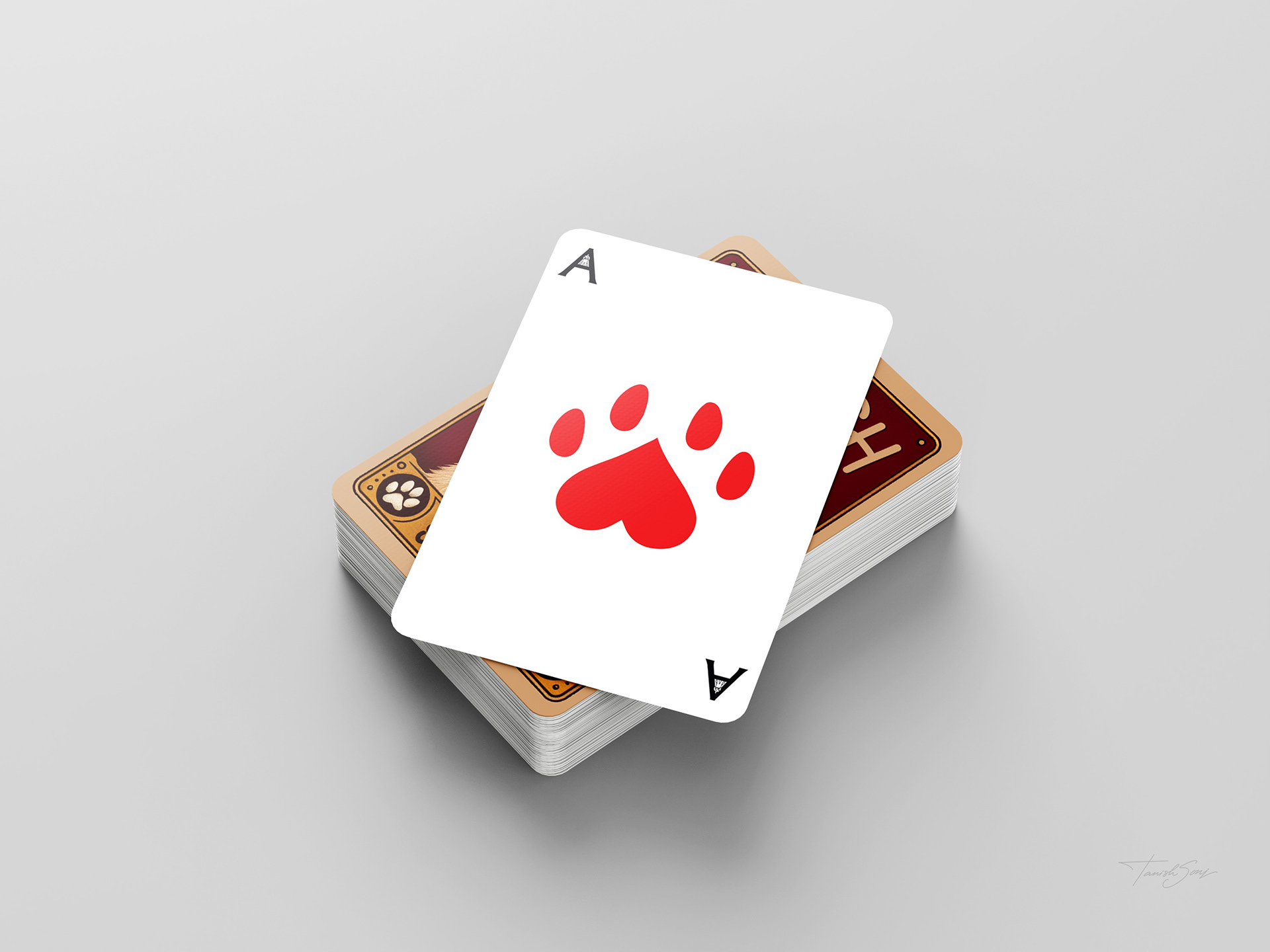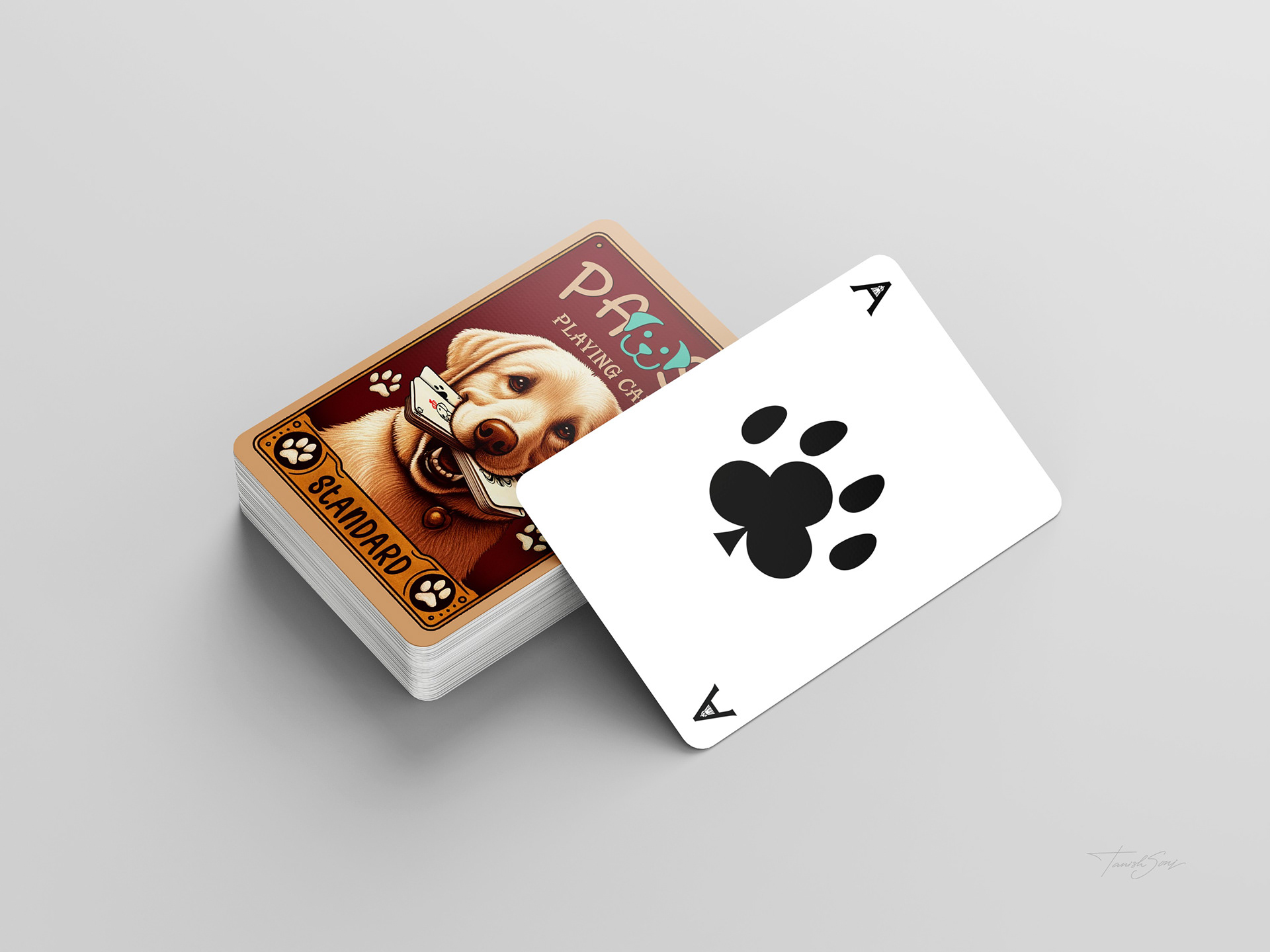 The playing cards reinterpret a classic deck through a focused dog themed system. The box features a vintage inspired illustration that gives the set a collectible presence. Across all suits, the Ace becomes a bold paw symbol, number cards progress through increasing dog footsteps, and the face cards introduce defined canine characters. The Jack stands with a cigar, the suit mark rising as smoke. The Queen appears in profile with a crown marked by the suit symbol. The King leans against a table, his crown placed beside him with the symbol embedded. Clean line work, generous space, and traditional corner indices keep the deck familiar while giving it a distinct identity.