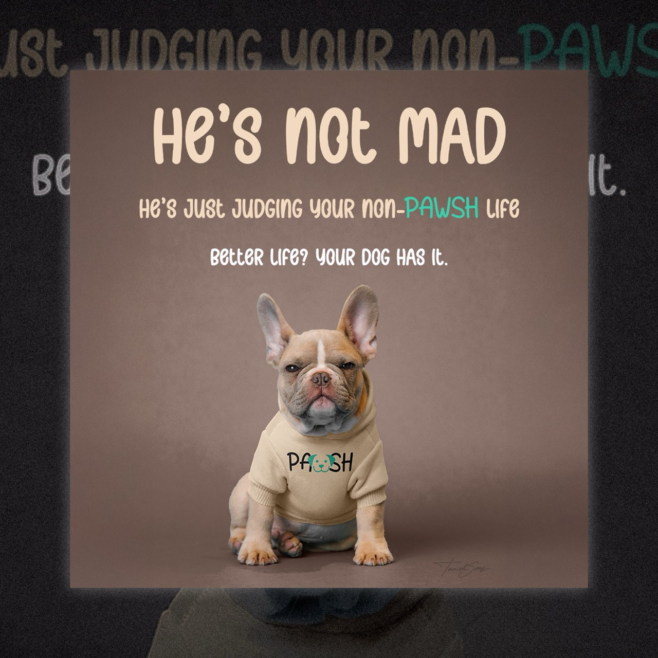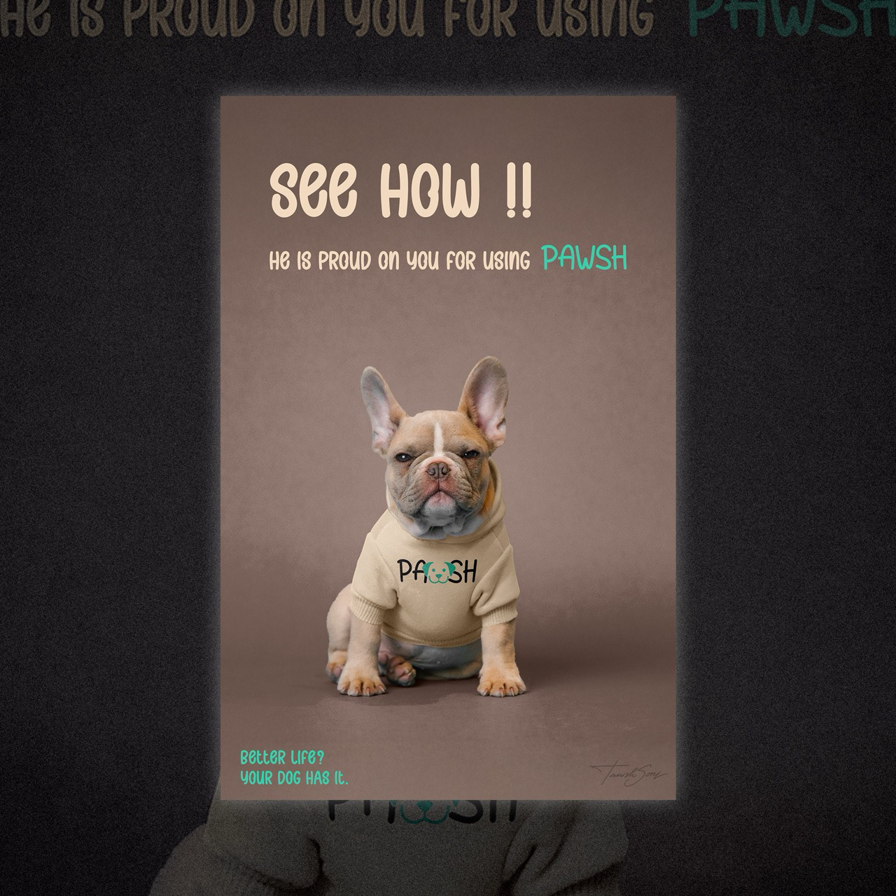 These advertising visuals use humor and attitude to give the brand a distinct voice. The confident expressions of the dog paired with bold, conversational headlines create an immediate emotional connection, making the message feel playful yet self assured. The neutral backdrop keeps the focus on the subject, while the soft beige and teal accents maintain visual consistency with the brand identity. By combining expressive imagery with light, witty copy, the designs position the dog as the judge of lifestyle standards, reinforcing the idea that a better life is not optional, it is expected.