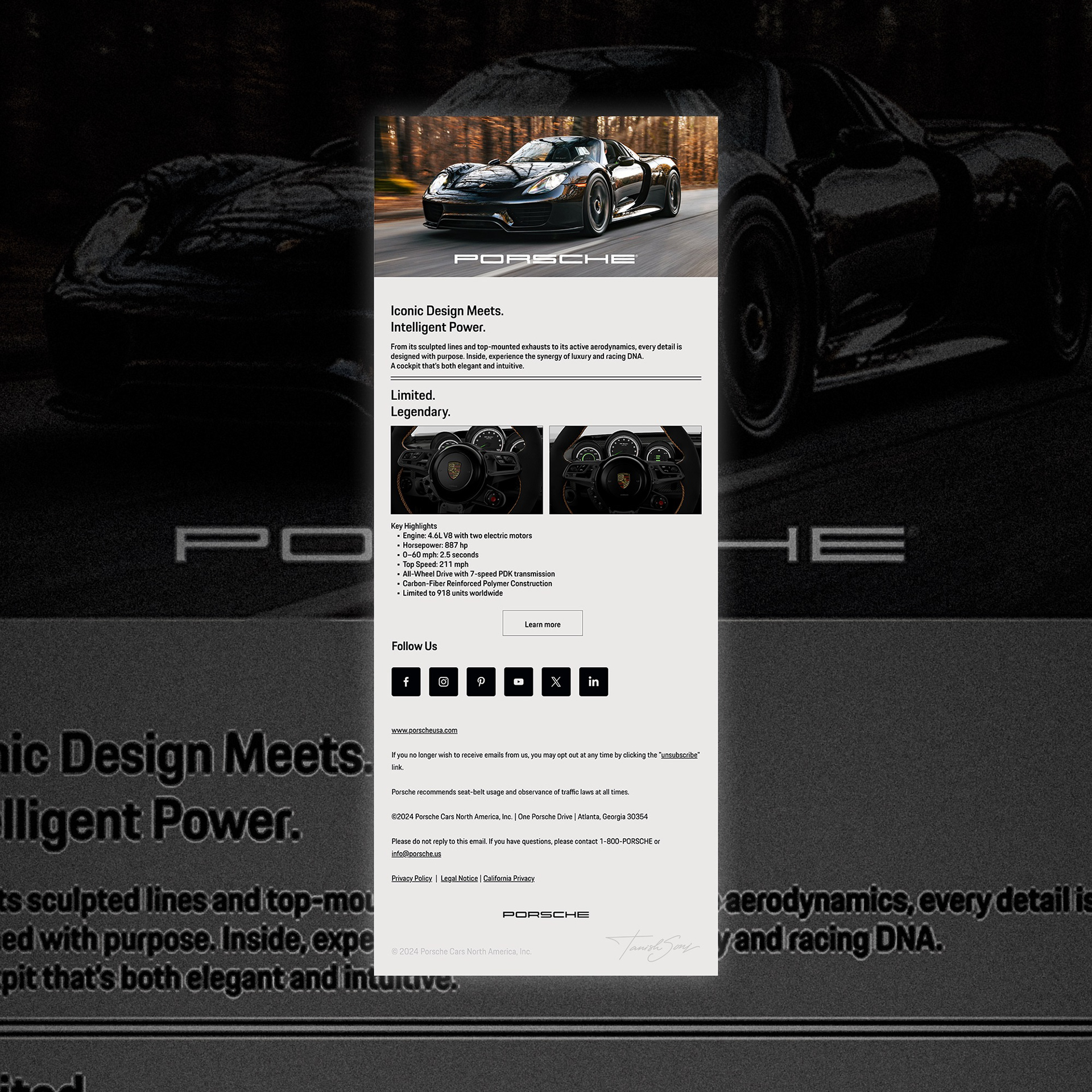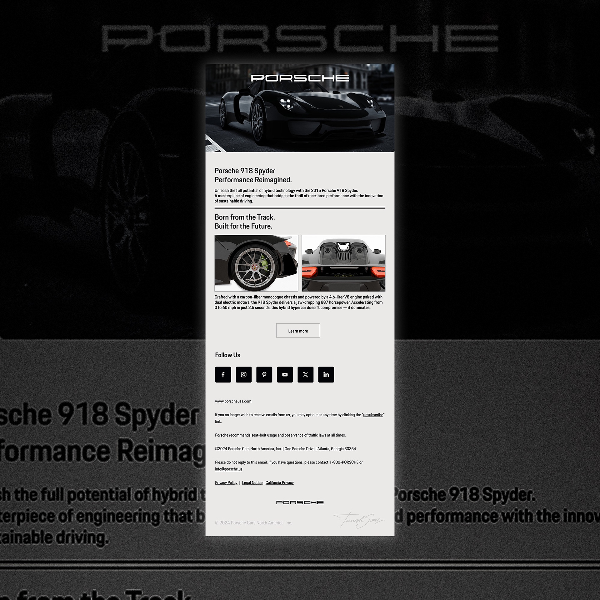 This newsletter delivers a focused, performance driven layout centered on the 918 Spyder. Custom 3D renders highlight the car with precision and cinematic depth, while clear headlines and structured spacing guide the reading experience. The footer references official Porsche communications, giving the concept a credible and brand aligned finish.