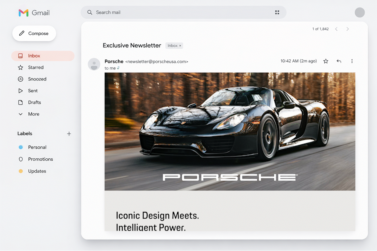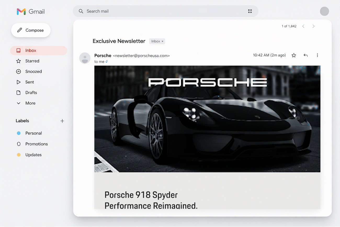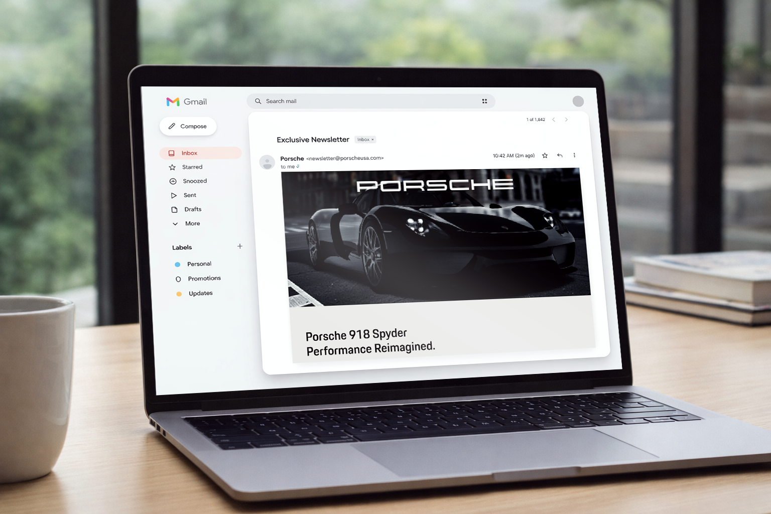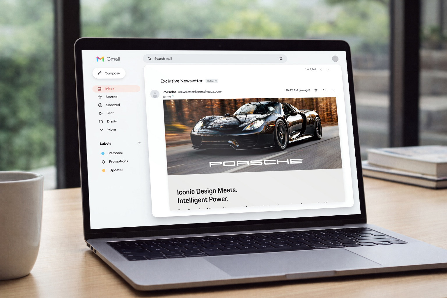 This newsletter opens with a dynamic hero image (stock photograph) to establish motion and realism. Interior visuals (custom 3D renders) highlight craftsmanship and engineering detail. Headlines and structured feature highlights move in rhythm with the imagery, delivering a communication that feels precise, confident, and unmistakably Porsche.