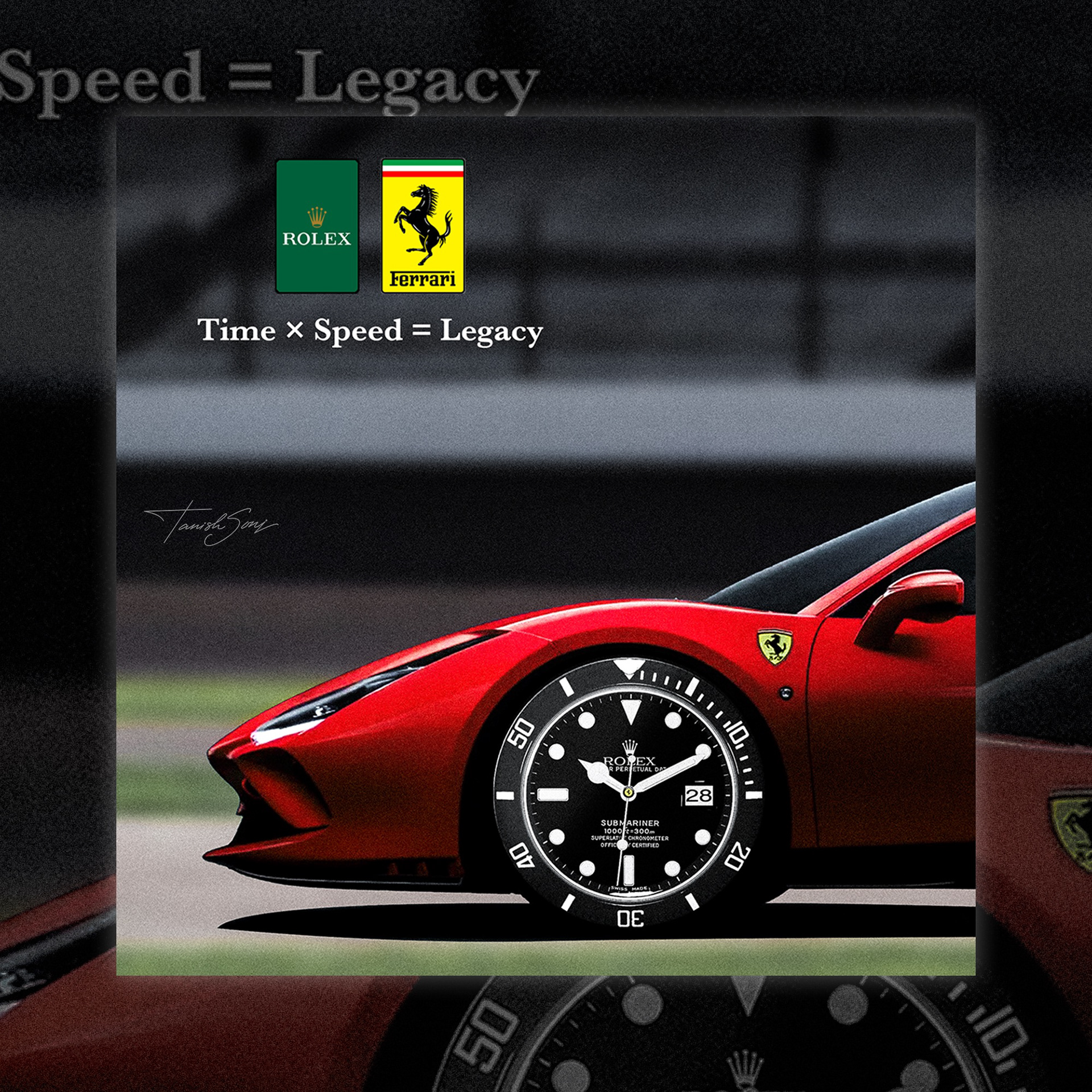 This visual brings together two icons built on performance and legacy. Ferrari represents speed, Rolex represents time. Together, they reflect the idea that true legacy is created when speed and time move in sync. It’s about pushing forward while honoring precision, where every second counts.
