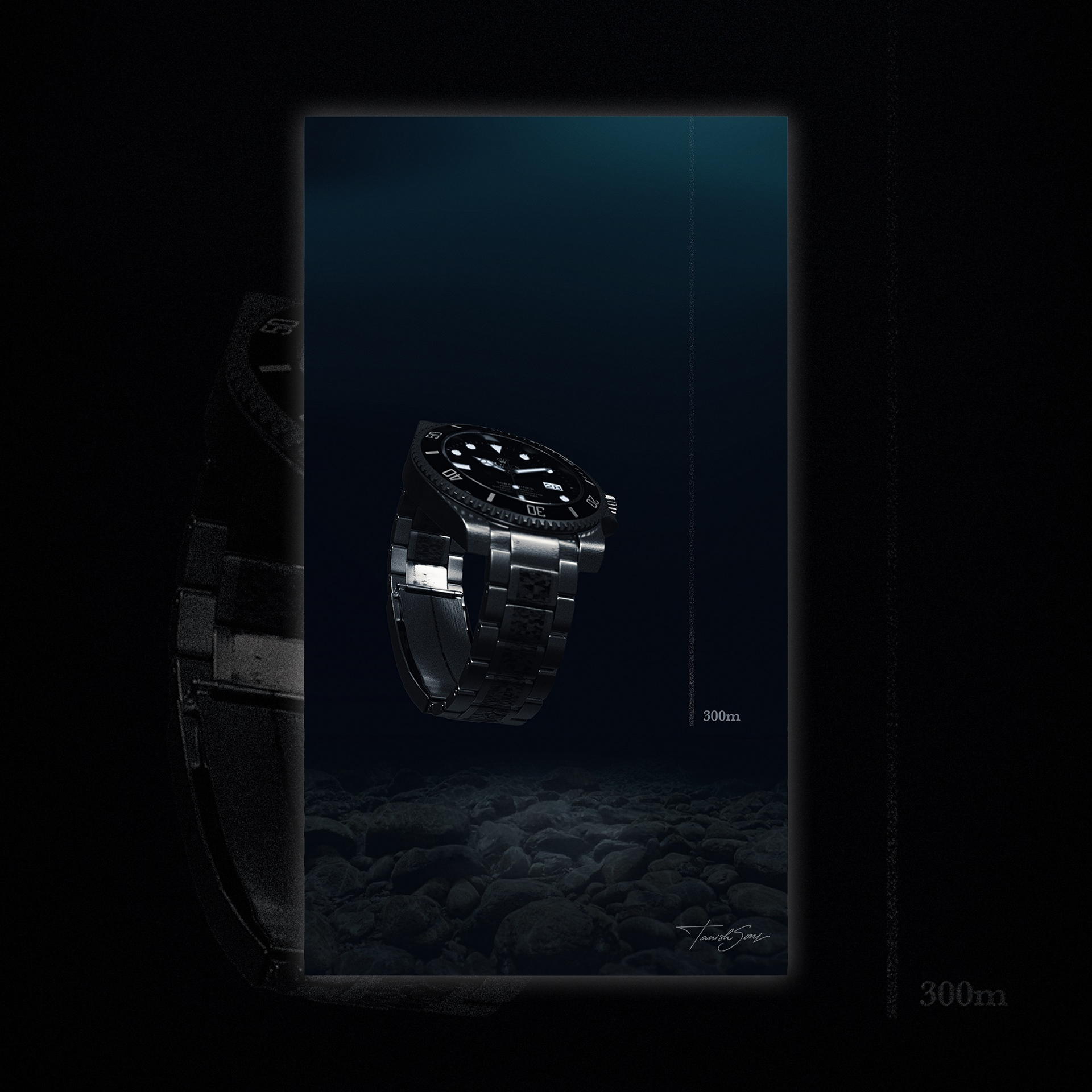 Set underwater, the Submariner (3D render) is shown above a rocky seabed in deep blue tones. The vertical depth line and “300m” detail clearly highlight its capability. Focused lighting keeps attention on the watch, reinforcing strength and reliability under pressure.